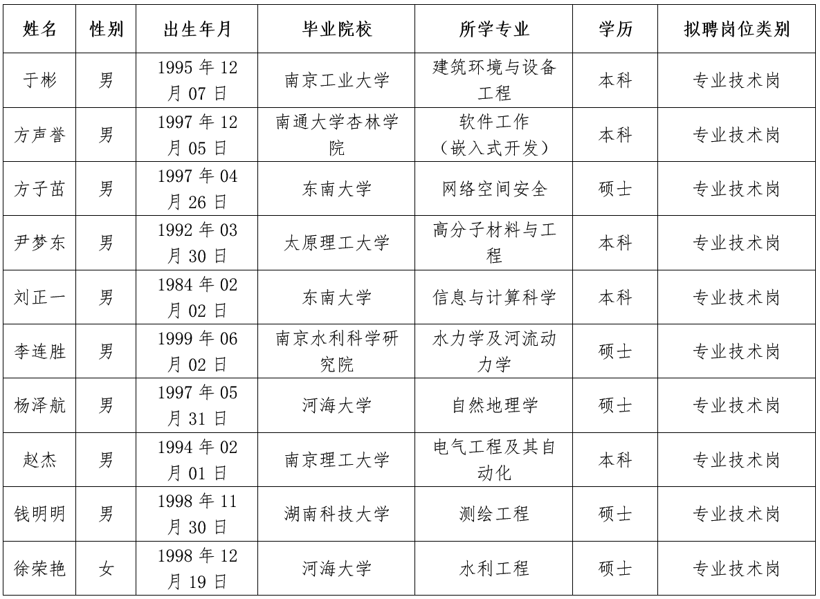 根據公開招聘工作有關要求,經過報名、資格審核、面試、體檢等程序,確定于彬等10人為南京瑞迪水利信息科技有限公司擬錄用人員(按姓氏筆畫排序),具體如下: